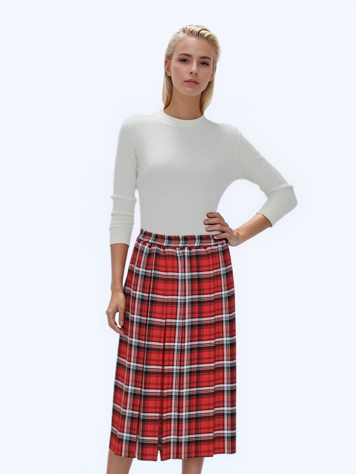 Elevate your wardrobe with this sophisticated red check pleated skirt. The crisp pleats add dimension and movement, while the structured straight silhouette flatters every frame. Fully lined for comfort and confidence, this versatile skirt pairs beautifully with everything from tailored blouses to cosy knits. The classic check pattern ensures you'll reach for it season after season, making it an investment piece that truly delivers on style and quality.