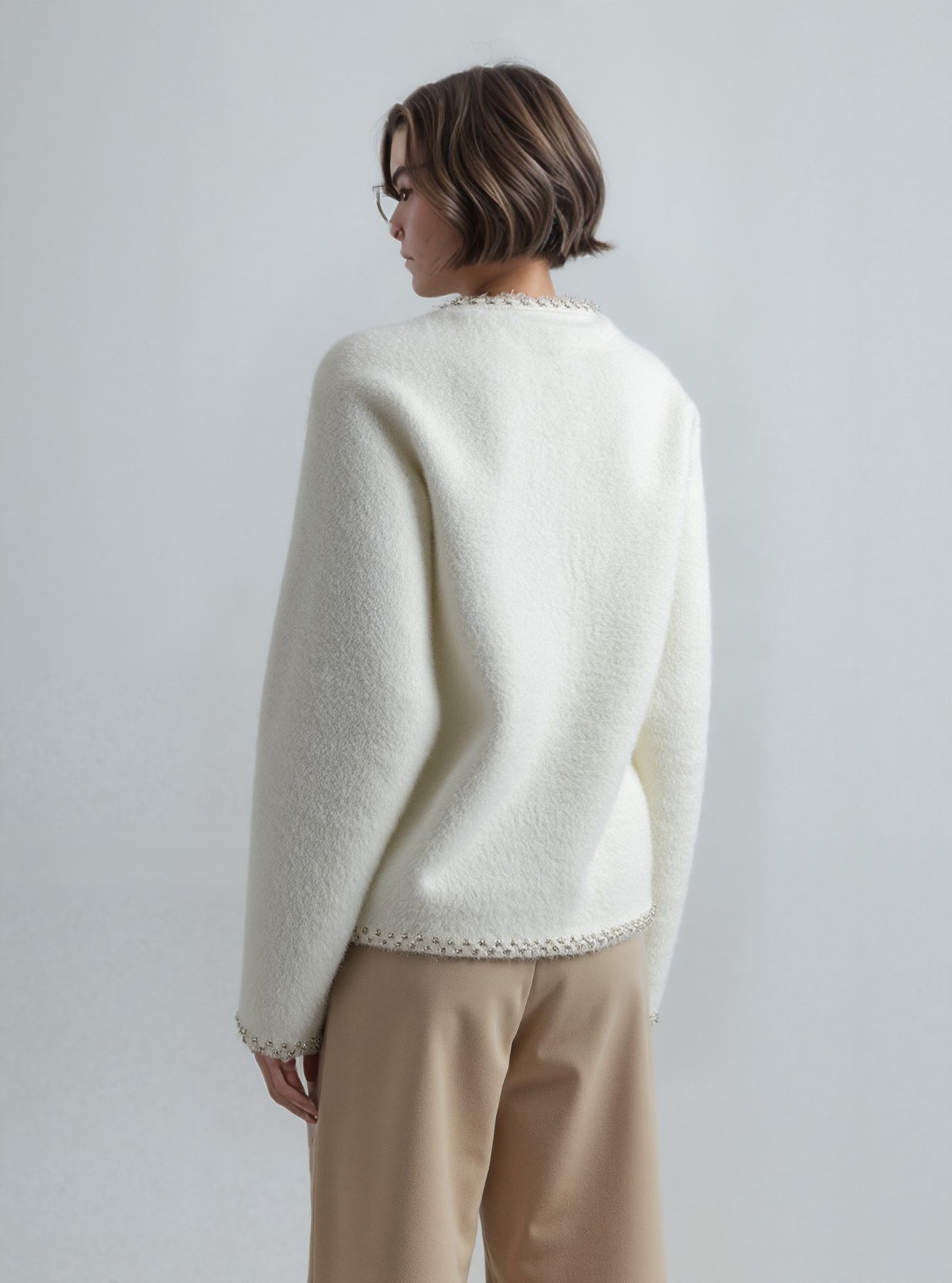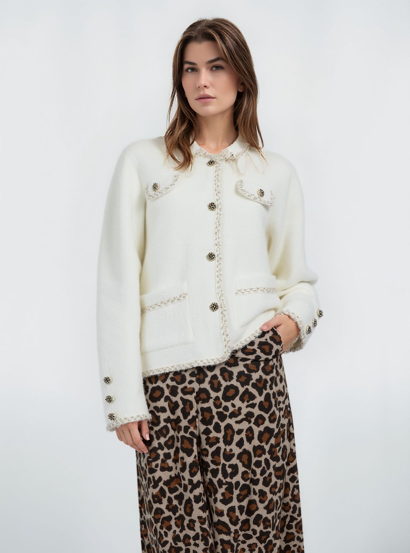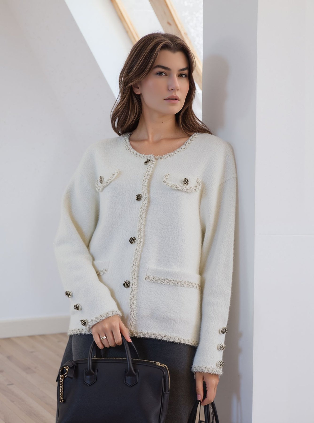 Elevate your everyday wardrobe with this sophisticated cream cardigan, crafted from luxuriously fine knit fabric that feels as good as it looks. Delicate embroidered detailing adds an artisanal touch, transforming a classic piece into something truly special. The button-up design offers effortless layering versatility—wear it over dresses, tees, or as a standalone statement. Perfect for transitional seasons, this timeless cardigan combines refined elegance with comfortable wearability, making it an essential investment for anyone seeking quality basics with character.