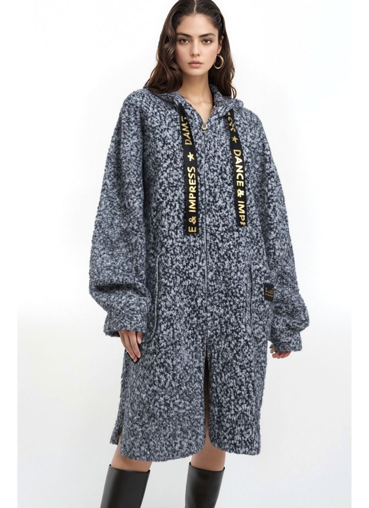 Grey Bouclé Hooded Coat - Longline, Cozy Fall/Winter Style