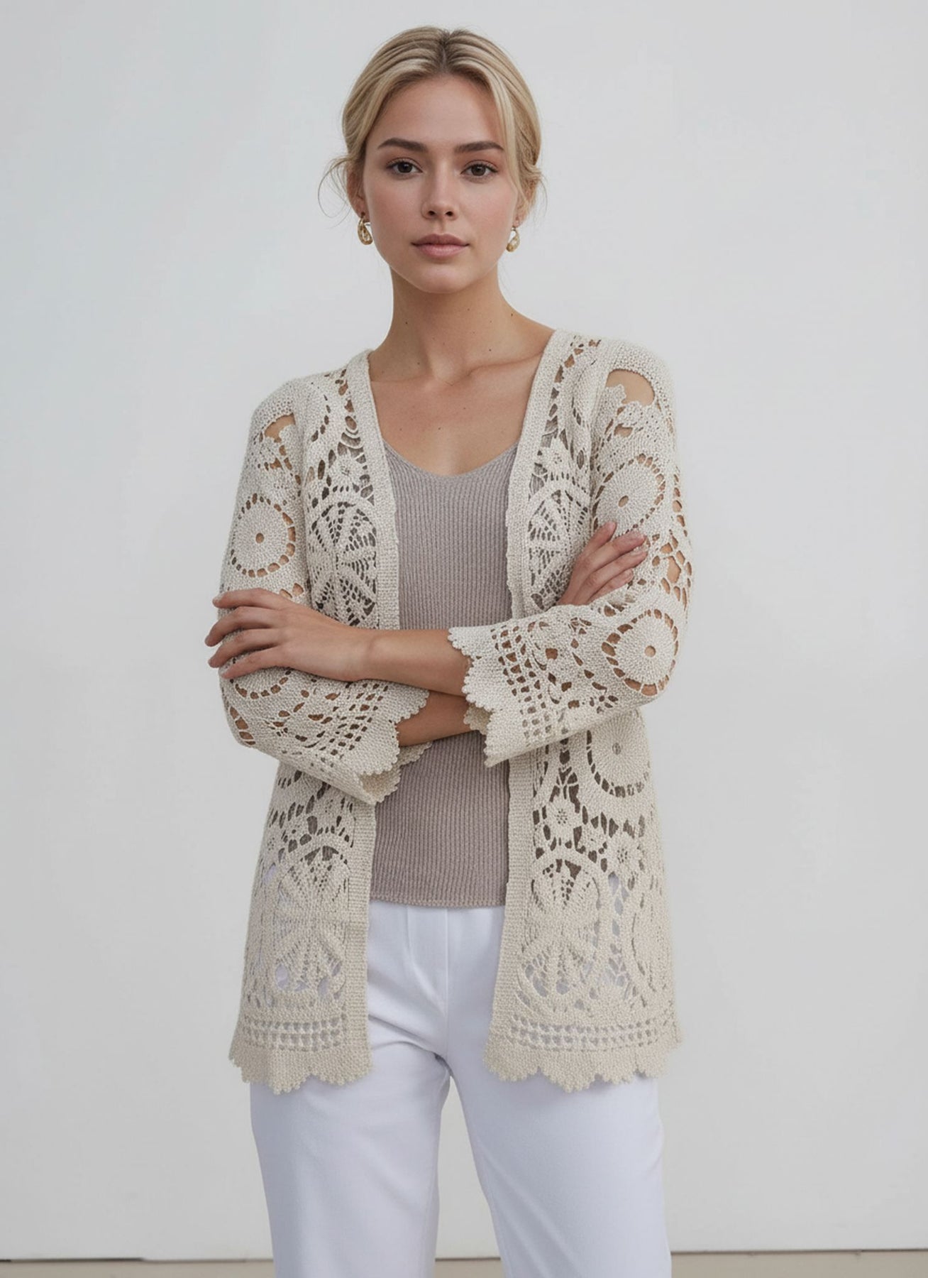 Add effortless elegance to your wardrobe with this lace cardigan, designed for lightweight layering and timeless style. Featuring a delicate crochet lace pattern, this open-front piece is perfect for elevating everyday outfits.