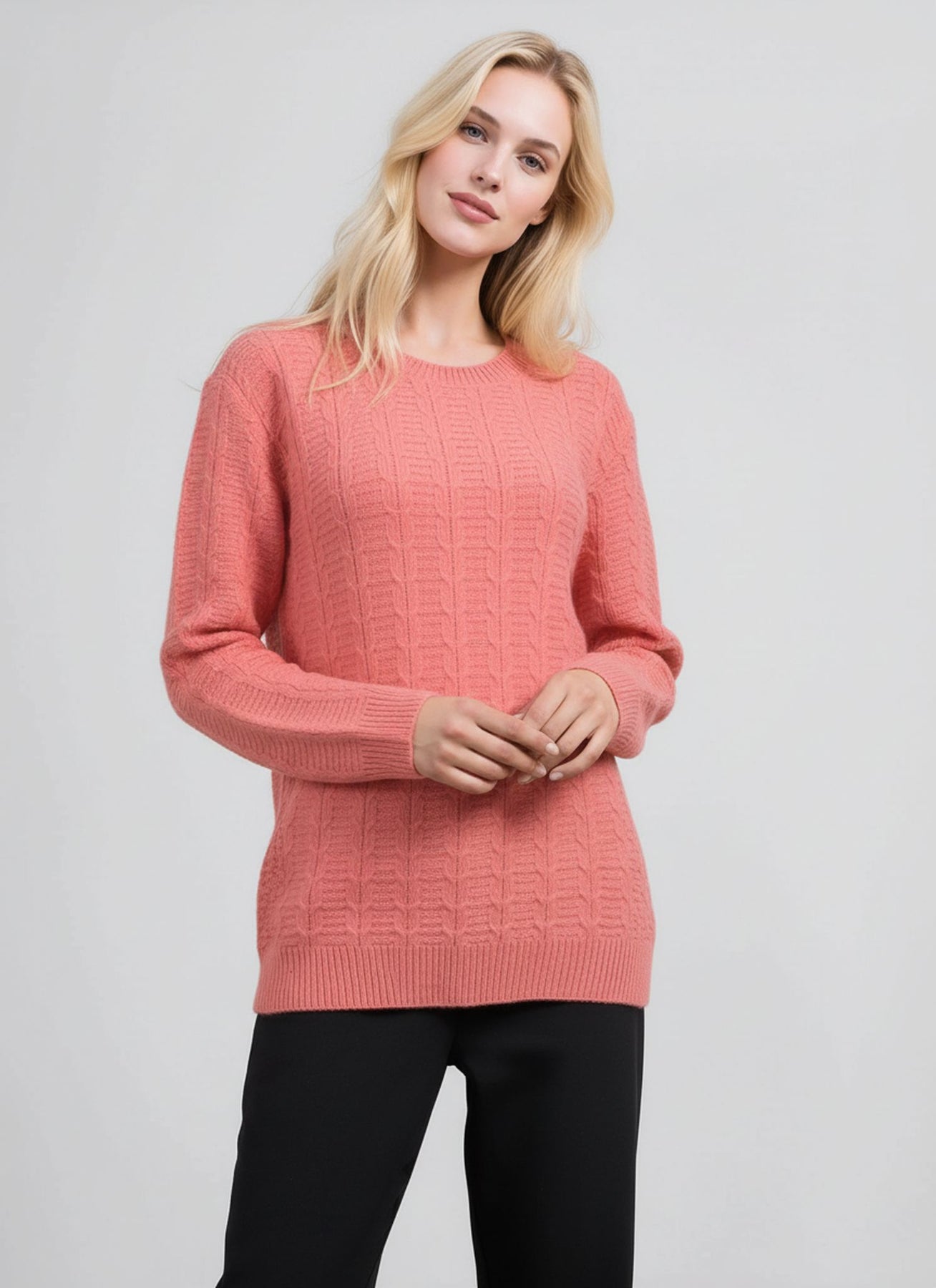 Elevate your everyday wardrobe with this refined coral cable stitch round jumper. Crafted with meticulous attention to detail, the intricate cable knit pattern adds textural depth and visual interest to a timeless silhouette. The soft, rounded neckline offers versatile styling options, seamlessly transitioning from casual weekends to polished occasions. Perfect for layering or wearing solo, this piece combines classic elegance with contemporary appeal, making it an essential addition to any discerning wardrobe.