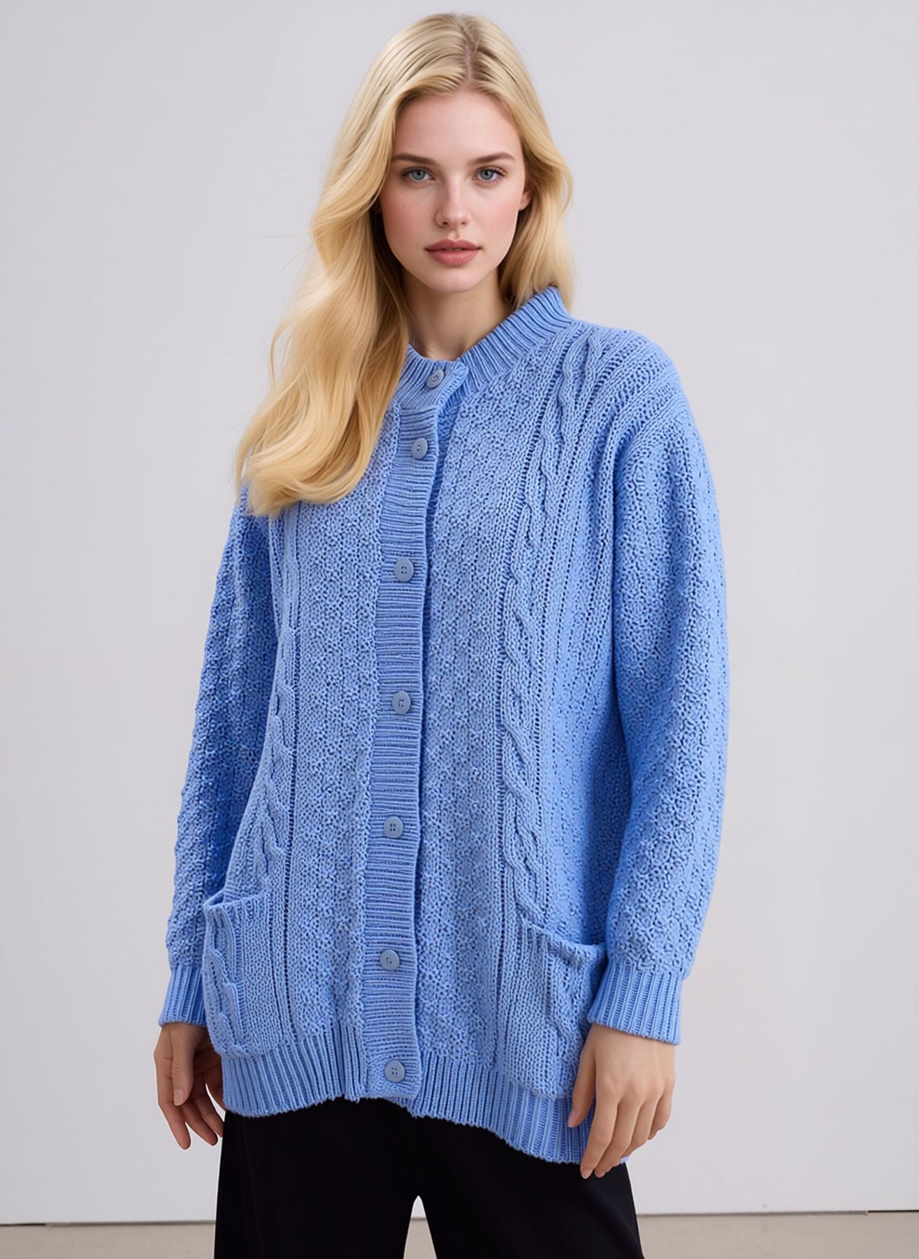 Embrace timeless elegance with this cable knit cardigan. It features a classic round neckline and functional front pockets for everyday practicality. The intricate cable knit pattern adds visual interest and dimension, while the relaxed fit ensures comfort for layering or wearing solo. Perfect for transitional seasons, this versatile piece pairs effortlessly with skirts or trousers for a polished, put-together look.
